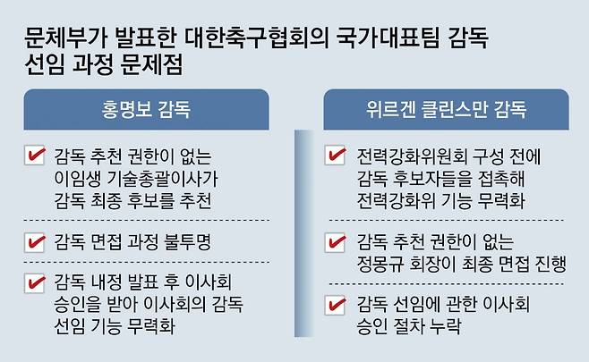 7월 축구협회 감사에 착수한 문체부는 절차 위반 등의 논란에 휩싸인 홍 감독과 위르겐 클린스만 전 감독 선임 과정을 들여다봤다. 문체부는 이날 “규정상 권한이 없는 이임생 기술총괄이사가 홍 감독을 최종 후보로 추천했다”고 지적했다. 이 이사는 후보자 추천 등 감독 선임 관련 업무를 맡은 전력강화위원회 소속이 아니고, 전력강화위원장으로 임명된 적도 없다는 것이다.