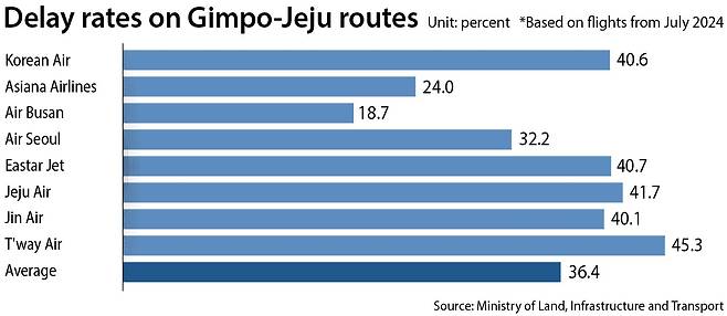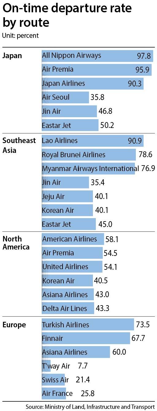 Air Seoul had the highest overall delay rate of domestic carriers during the first seven months of this year, with 2,476 of the 5,678 international flights the airline operated in July departing late. Airlines with the highest on-time departure frequency included All Nippon Airways, 97.8 percent of whose Japanese flights took off punctually; Lao Airlines, whose Southeast Asian routes achieved 90.9 percent; and Turkish Airlines, whose trips to Europe departed on time at a rate of 73.5 percent.