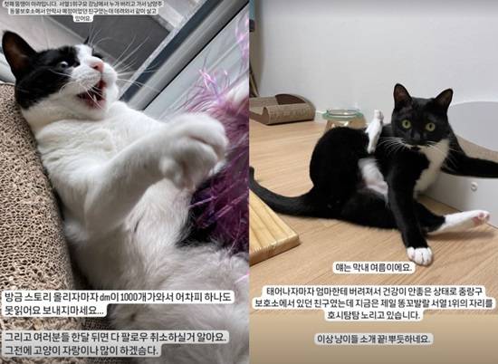 이어 그는 "첫째 뚱땡이 아라입니다. 강남에서 누가 버리고 가서 남양주 동물보호소에서 안락사 예정이던 친구였는데 데려와서 같이 살고 있어요", "얘는 막내 여름이에요. 건강이 안 좋은 상태로 보호소에 있던 친구였는데 지금은 제일 똥꼬발랄 서열 1위의 자리를 노리고 있습니다" 등 귀여운 반려묘들 사진과 함께 소개를 덧붙였다.
