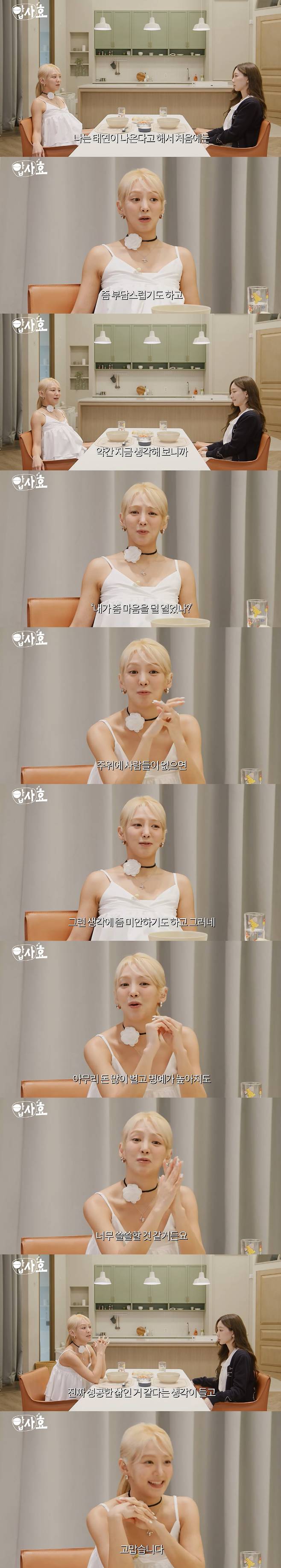 태연은 "어쨌든 그게 단체 생활이니까 티 내고 싶지 않았고 피해주고 싶었다"라면서 남다른 배려심을 보여줬다.