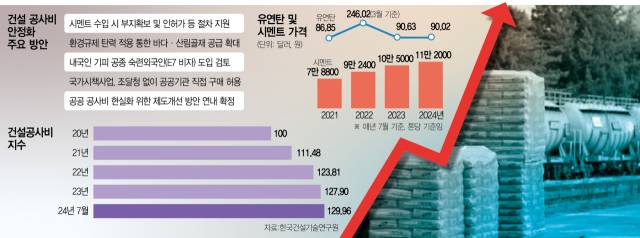 정부는 이날 경제관계장관회의에서 건설공사비 안정화 방안을 통해 최근 3년간 연평균 8.5%에 달했던 건설공사비 상승 폭을 2026년까지 2%대로 낮추겠다고 밝혔다. 주요 방안으로는 △민간 업체의 시멘트 수입 시 부지 확보 및 인허가 등 절차 지원 △바다·산림골재 공급 확대 △내국인 기피 건설 공종에 한해 숙련 외국인 도입 검토 △공공 공사비 현실화 제도 개선 연내 확정 등이다. 이는 공사비 급등에 주택 공급이 감소하는 데 따른 조치다. 공급 선행지표인 주택 인허가 물량은 올해 1~8월 기준 3만 2458가구로 전년 동기 대비 12.3% 줄었다.