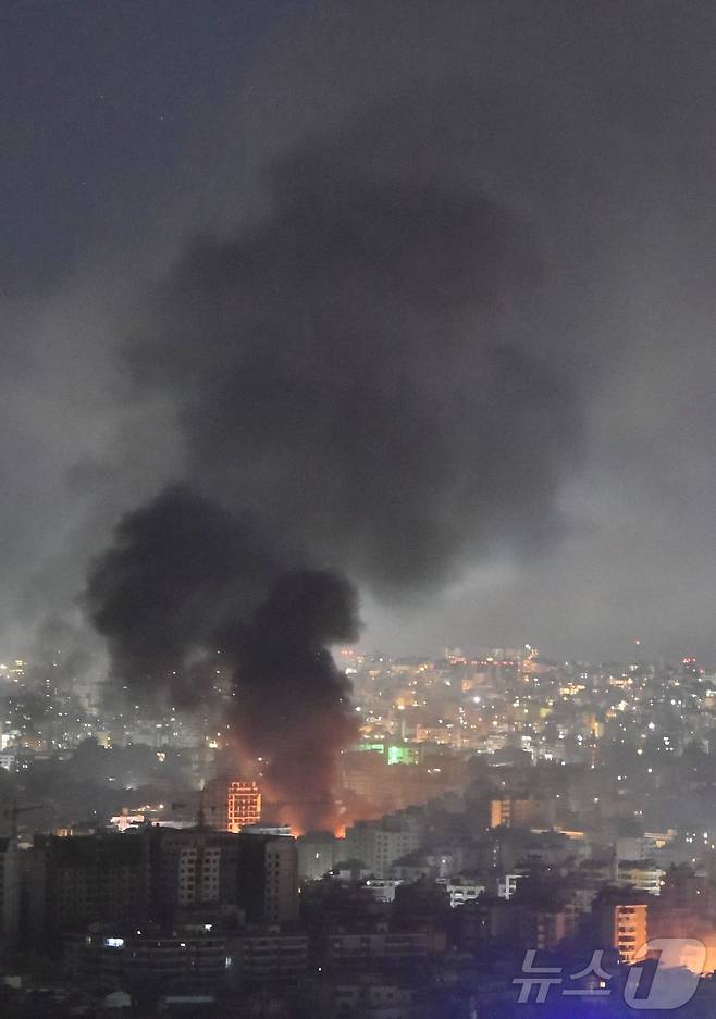 (베이루트 AFP=뉴스1) 우동명 기자 = 3일(현지시간) 레바논 베이루트 남부 교외에서 헤즈볼라와 적대 행위 중인 이스라엘 군의 공습을 받아 연기 기둥이 솟아 오르는 모습이 보인다. 2024.10.03