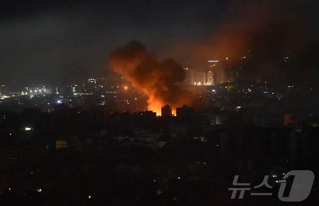 (베이루트 AFP=뉴스1) 우동명 기자 = 3일(현지시간) 레바논 베이루트 남부 교외에서 헤즈볼라와 적대 행위 중인 이스라엘 군의 공습을 받아 불 기둥이 솟아 오르고 있다. 2024.10.03