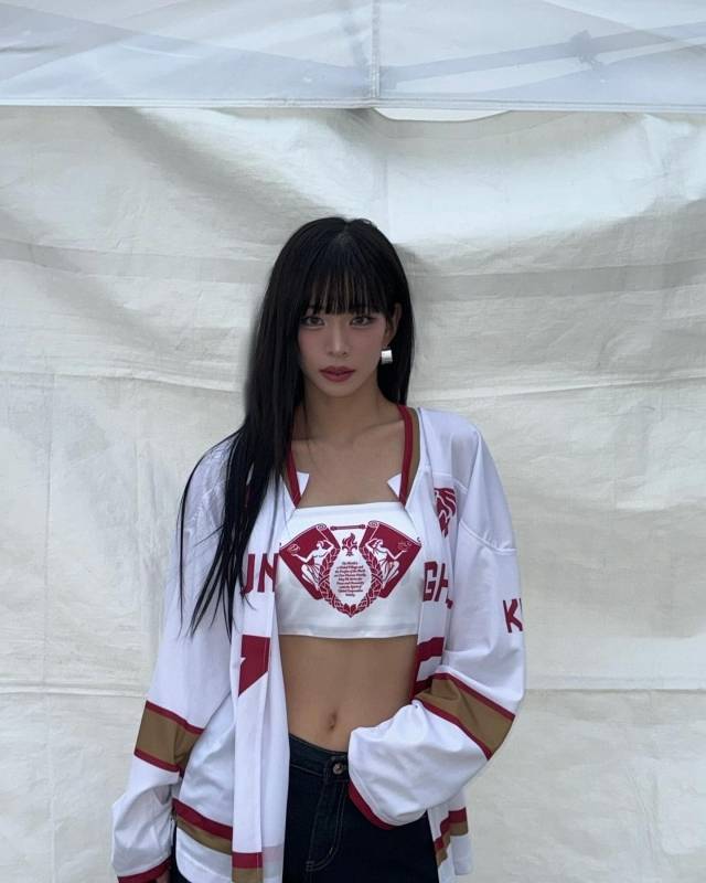 대학 축제 현장을 찾은 모습. 과감한 의상에 드러난 몸매가 감탄을 유발한다. 늘씬한 허리 라인으로 남다른 패션 소화력을 보여준 이채영이다.