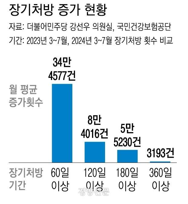국회 보건복지위원회 소속 더불어민주당 강선우 의원실이 국민건강보험공단에서 받은 월별 장기처방 현황을 보면, 전공의 집단 이탈 직후인 올해 3~7월 장기처방 건수는 지난해 같은 기간에 비해 크게 증가했다. 이 기간 60일 이상 장기처방 건수는 월 평균 639만7518건으로, 지난해 같은 기간(605만2941건)에 비해 34만4577건 증가했다. 120일 이상 처방은 월 평균 8만4016건, 180일 이상은 월 평균 5만5230건 늘어났다. 360일 이상 장기처방도 3193건이나 증가했는데, 이는 지난해에 비해 13%나 늘어난 수치다.