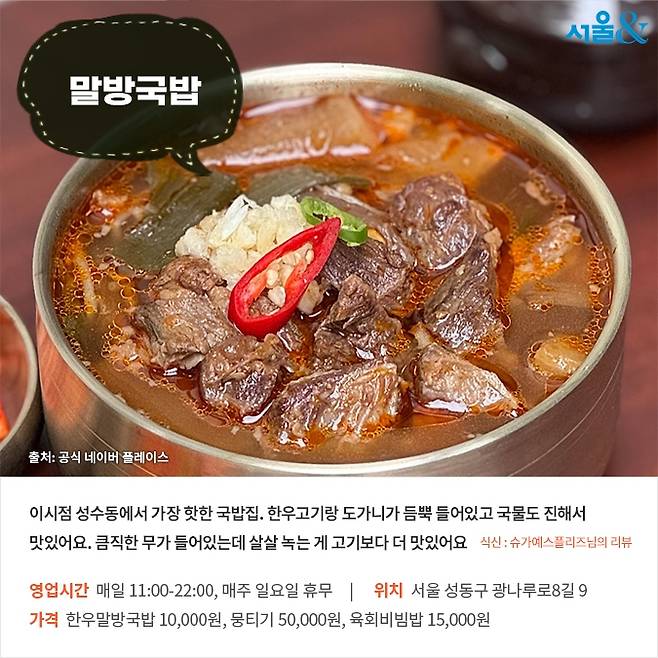 ▲후기(식신 슈가예스플리즈): 이시점 성수동에서 가장 핫한 국밥집. 한우고기랑 도가니가 듬뿍 들어있고 국물도 진해서 맛있었어요. 큼직한 무가 들어있는데 살살 녹는 게 고기보다 더 맛있어요
