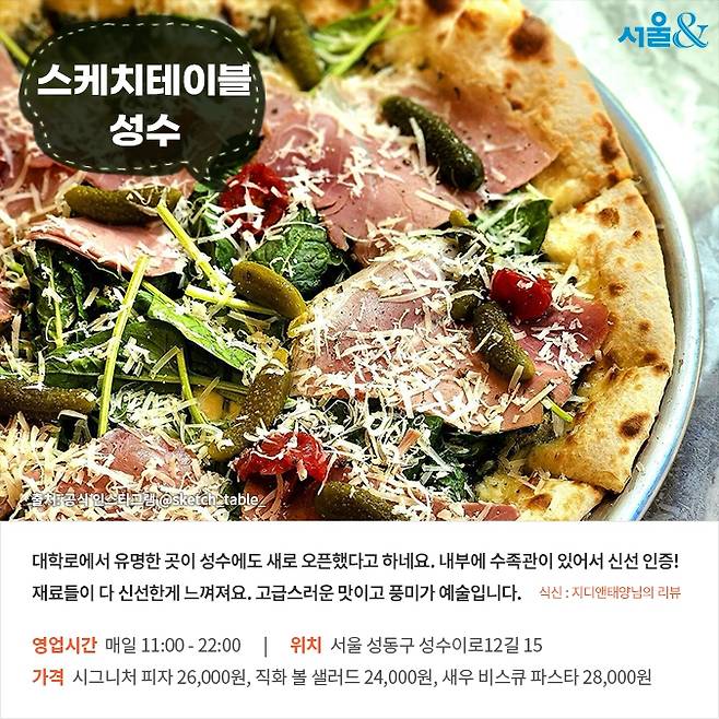 이탈리아 거리를 걷다 우연히 들어온 듯한 따뜻한 감성의 레스토랑. 대학로에서 인기가 많은 스케치테이블이 성수에 새로운 매장을 열었다. 파스타와 샐러드, 피자, 스테이크 등의 이탈리안 요리를 선보인다. 특히 들어서자마자 보이는 수족관에서 직접 조개류를 꺼내 요리에 사용하기 때문에 신선함이 살아있는 요리가 특징. 우삼겹 베이컨, 새우, 콩피한 마늘과 에멘탈 치즈가 올라간 ‘시그니처 피자’는 빼놓을 수 없는 대표 메뉴다.