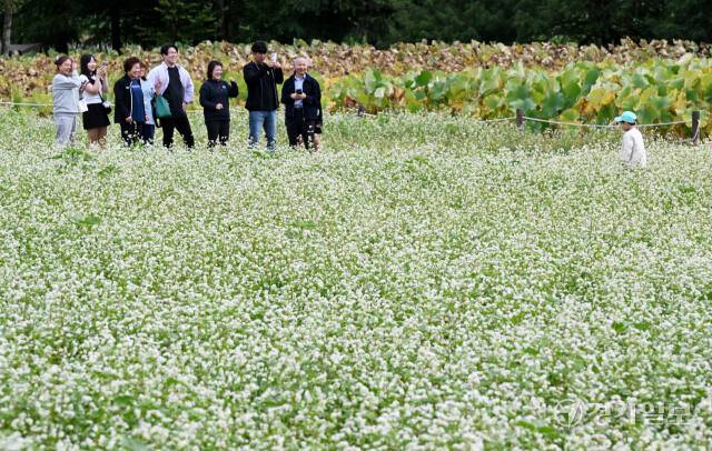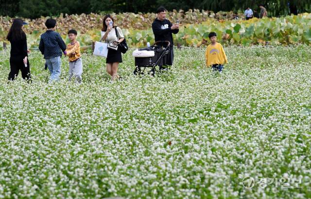 개천절인 3일 오후 청명한 휴일을 맞아 수원탑동시민농장을 찾은 나들이객들이 하얀 메밀 꽃밭을 거닐며 가을 정취를 만끽하고 있다.