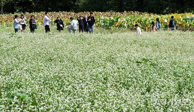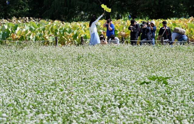 개천절인 3일 오후 청명한 휴일을 맞아 수원탑동시민농장을 찾은 사진 동호인들이 하얀 메밀꽃 등 가을풍경을 촬영하고 있다.