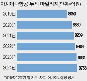 3일 아시아나항공 공시에 따르면 쌓여 있는 마일리지를 금액으로 환산할 경우 2분기 말 기준 9758억 원에 달한다. 2019년엔 8063억 원이었는데 5년 새 1700억 원 가량 늘었다.