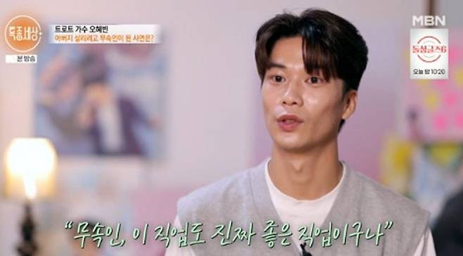 오혜빈은 “가수의 꿈을 꾸고 있는 8년차 무당이다. 2017년에 신령님을 모셔서 2024년까지 햇수로 8년이 됐다. (신내림을)앞뒤 안 가리고 아버지 살리려고 받은 것 같다”라고 떠올렸다.
