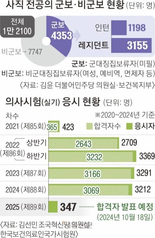 지난 2월 병원을 이탈한 전공의(인턴+레지던트) 1만 2000여명 중 내년에 군의관이나 공중보건의사(공보의)로 입영해야 하는 전공의가 3155명으로 예년에 비해 크게 늘어난 반면 이들의 빈자리를 메울 신규 의사 배출 시험에는 지난해의 10분의1만 응시한 것으로 확인됐다.