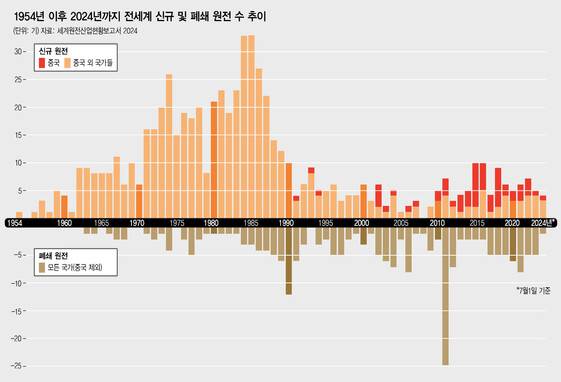 이런 흐름은 최근에도 이어진다. 2004~2023년 20년 동안 신규 원전이 102기였던 반면, 폐쇄 원전은 104기였다. 게다가 신규 원전 가운데 49기가 중국 것이라, 중국을 제외하면 이 기간 세계적으로 51기의 원전이 순감했다.