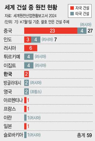 국내엔 잘 알려져 있지 않지만, 세계의 신규 원전 시장은 사실상 러시아가 장악하고 있다. 지난 7월1일 기준 세계적으로 건설 중인 원전이 59기인데, 이 가운데 20기를 중국, 인도, 튀르키예 등지에서 러시아가 짓고 있다.
