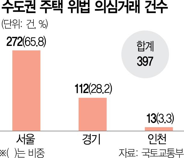 조사 결과 편법증여, 대출자금 유용, 계약일 거짓신고 등 위법이 의심되는 397건의 거래를 적발했다. 지역별로 보면 서울 272건(68.5%), 경기 112건(28.2%), 인천 13건(3.3%)이다. 구별로는 서울의 경우 강남구 52건, 송파구 49건, 서초구 35건, 용산구 23건, 성동구 20건, 마포구 18건, 영등포구 12건, 광진구 11건 순이었다. 집값이 큰 폭으로 뛴 강남3구·마용성 단지에서 위법 의심 거래가 다수 적발된 것이다.