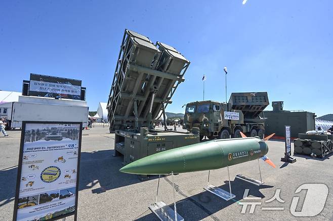 첨단 신규장비 전력화 행사를 실시한 우레(전술지대지유도무기 KTSSM)가 지상군페스티벌 행사장에 전시돼 있다. 한국형 3축 체계 전력 보강을 위해 도입된 우레는 유사시 북한의 핵과 미사일 위협을 무력화 시킬 전술급 탄도미사일이다. (육군 제공) 2024.10.4/뉴스1