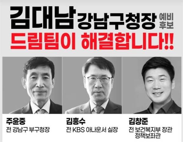 | ▲ 김대남 전 대통령실 행정관이 강남구청장 예비후보로 출마 당시 포스터. 김흥수씨도 선거전에 참여했다. |