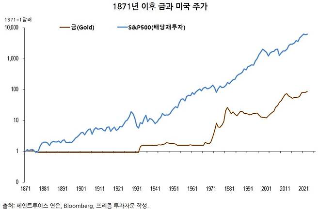 금의 상승 원인을 이해하기 위해서는 역사적인 변화를 알아야 한다. 아래 [그림]은 1871년 이후 미국 S&P500지수와 온스 당 금값의 추이를 보여준다. 금의 장기성과는 주식에 투자한 것에 비해 크게 뒤처지지만, 1930년대와 70년대 그리고 2000년대에는 반대로 주식에 비해 금이 압도적인 강세를 보인 것을 발견할 수 있다.