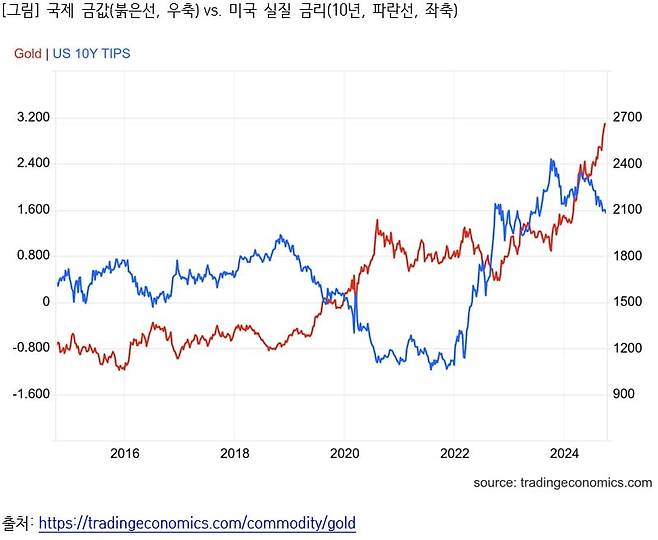 아래 [그림]은 미국의 인플레 연동 국채 금리와 금값의 관계를 보여주는데, 인플레 연동 국채는 한 해 동안 발생한 인플레만큼 채권 원리금을 인상해주는 상품이다. 따라서 인플레가 발생하더라도 이 채권의 실질적인 가치가 보장되기에, 물가연동국채의 금리는 실질금리의 성격을 가지고 있다. 2019년부터 실질금리가 마이너스로 내려갈 때는 금값이 오르고, 반대로 2022년처럼 연준의 금리인상이 시작되며 실질금리가 오를 때에는 금값이 큰 폭의 조정을 겪는다.