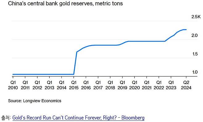 이스라엘과 이란의 전면전 가능성이 높아진 게 ‘안전자산’인 금에 대한 투자 수요를 높인 첫 번째 요인임이 분명하다. 2023년 10월 시작된 ‘이스라엘-하마스’ 전쟁을 기점으로 상승한 금값이 최근 한 번 더 점프한 것이 이를 방증한다. 여기에 아래 [그림]에 나타난 것처럼, 중국 인민은행의 금 보유량이 2022년 하반기부터 본격적으로 늘어난 것도 영향을 미쳤다. 2022년 러시아의 우크라이나 침공 이후, 러시아가 보유한 외화자산이 동결되는 것을 지켜보며 중국의 금 보유량이 늘어난 것이다. 만에 하나 양안 갈등이 전쟁으로 비화하는 경우를 대비해 금을 비축하려는 것 아니냐는 관측이 제기되는 중이다.