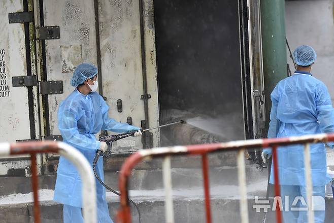 [비엔호아=AP/뉴시스] 3일(현지시각) 베트남 비엔호아의 동쏘아이 동물원에서 관계자들이 조류 인플루엔자 A형(H5N1) 바이러스에 감염돼 죽은 호랑이 사체들을 방역하고 있다. 2024.10.04.