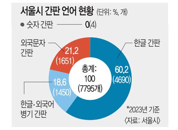 4일 국민일보가 서울시를 통해 확보한 지난해 시내 간판 조사 결과를 보면 7795개 간판 중 1651개(21.2%)가 외국어만 적힌 간판으로 확인됐다. 한글과 외국어를 함께 적은 간판은 1450개로 18.6%였다. 모두 한글로 적혀 있는 간판은 4690개(60.2%)로 조사됐다.