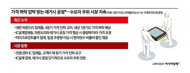 5일 업계에 따르면 레거시 공정은 전원 관리 칩(PMIC)과 드라이버 집적회로(IC)와 같은 주요 제품의 수요 부진으로 가격 하락 압박이 커지고 있다. 대만 주요 파운드리 업체들인 대만 2위 마이크로일렉트로닉스(UMC), TSMC 계열사 뱅가드국제반도체그룹(VIS), 대만 3위 PSMC는 4분기에 들어서면서 레거시 공정 제품 가격을 더는 방어하지 못하고 하락세를 보이고 있다. 전문가들은 구형공정 가격이 한 자릿수 퍼센트대로 인하될 가능성이 크고 이런 하락세는 내년 1분기까지 이어질 수 있다고 진단한다.
