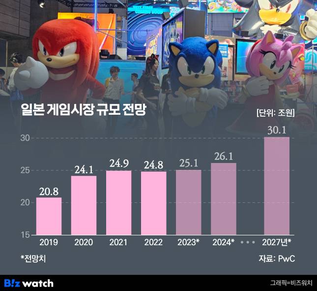 [도쿄=김동훈 기자] 30조원. 오는 2027년 예상되는 일본 게임시장 규모다. PwC에 따르면 일본 게임 시장 규모는 2022년(약 24조8000억원)부터 2027년까지 연평균 4%가량 성장할 전망이다. 금액으로 따지면 5년간 5조원 이상 성장한다는 얘기다.