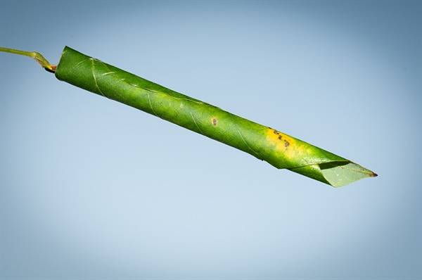 | ▲ 잎말이나방 애벌레의 요람. 먹이식물의 잎을 김밥처럼 말고 숨어 산다. |