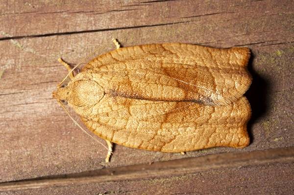 | ▲ 종 모양 맵시의 뿔날개잎말이나방. 여러 유실수의 잎사귀를 말고 그 속에 숨어 산다. |