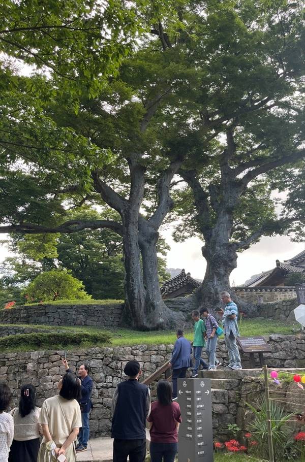 김광수 시인을 따라 계속 걸으며 유명한 대흥사 연리근을 만났다. 500년 된 느티나무 두 그루의 뿌리가 서로 연결돼 하나의 울창한 나무로 자라고 있었다. 바로 옆에는 연리근의 기운을 받아 지극한 소망을 이루고자 하는 사람들이 달아둔 종이 등과 소원지가 바람에 나부낀다.