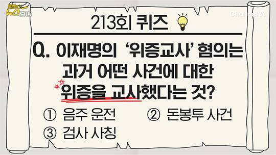 재판부는 완전히 다른, 양측의 4단계 논리를 바탕으로 다음달 25일, 한쪽 손을 들어줘야 합니다. 양 쪽의 논리는 다 공개가 됐습니다. 그러면 증거가 있어야겠죠. 그 핵심 증거, 내일은 이 대표와 김진성 씨, 둘 사이 통화한 내용을 자세히 짚어봅니다. 이 대표 측이 위증교사가 없었다는 증거라며 마지막 결심 공판 때 처음 제시한 녹취도 살펴보겠습니다. 오늘의 퀴즈 나갑니다.