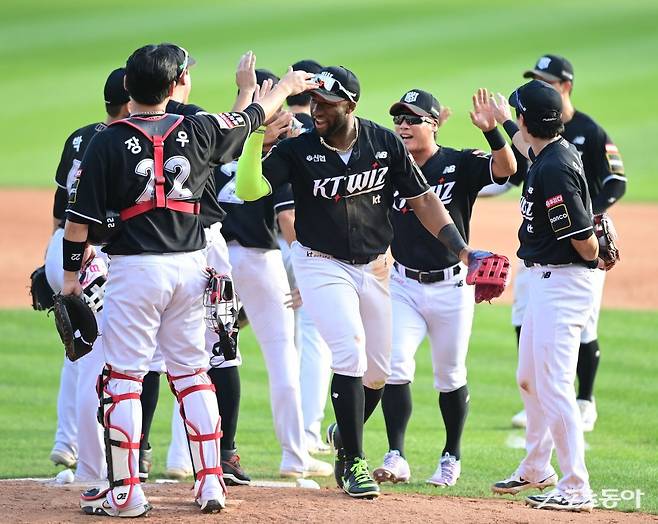 5일 서울 잠실야구장에서 열린 ‘2024 신한 SOL 뱅크 KBO리그 포스트시즌’ KT 위즈와 LG 트윈스의 준플레이오프 1차전 경기에서 3-2로 승리한 KT 선수들이 기쁨을 나누고 있다. 잠실 | 주현희 기자 teth1147@donga.com