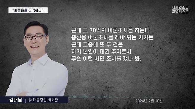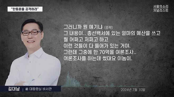 <서울의소리>가 공개한 녹취록은 국민의힘 전당대회를 앞둔 지난 7월 10일 통화 내용으로 김 전 행정관이 총선 여론조사의 문제점을 언급하면서 한동훈의 대권조사를 지목했고, 이를 "기업으로 따지면 횡령"이라고 공격한 내용이다.