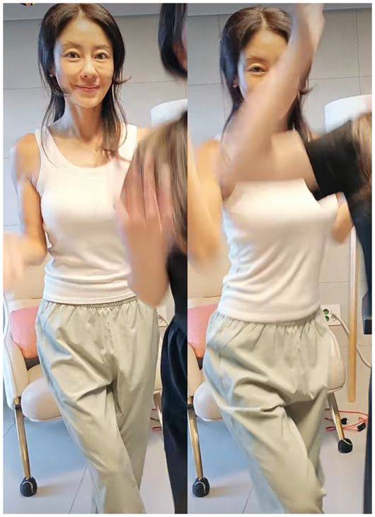이지현은 딸과 함께 영상을 찍었는데, 민소매를 입은 이지현은 운동으로 다져진 남다른 몸매를 뽐냈다.