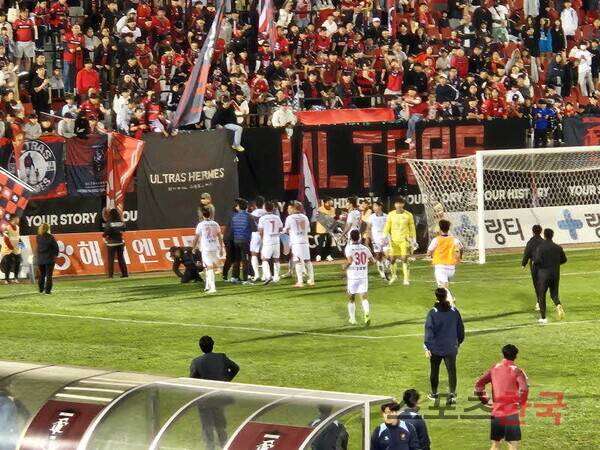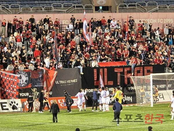 충북청주의 수비수 이한샘이 경기 종료 직후 부천FC 서포터즈와 거친 논쟁을 펼쳐 선수단이 이를 급하게 막아서는 모습이 연출됐다.