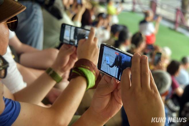 코끼리쇼에 참석한 관광객들이 화가코끼리들이 그리는 그림을 유심히 살펴보고 있다.