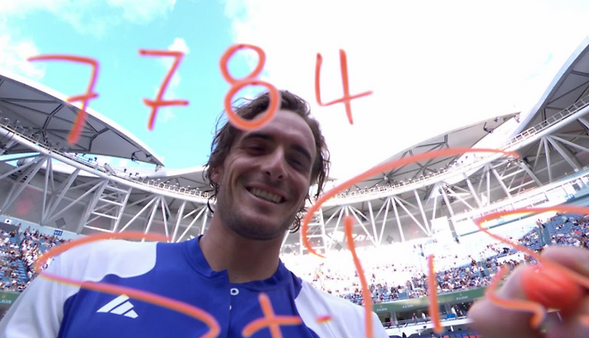 치치파스는 승리 후 가까이 있던 카메라 렌즈에 '7784'라는 숫자를 적었다.