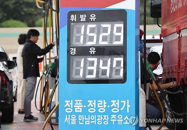 (서울=연합뉴스) 이재희 기자 = 6일 서울 만남의광장 주유소 앞에 휘발유 가격이 게시돼 있다. 한국석유공사 유가정보시스템 오피넷에 따르면 10월 첫째 주(9월29일∼10월3일) 전국 주유소 휘발유 평균 판매가는 직전 주 대비 ℓ당 12.8원 하락한 1천587.6원을 기록했다. 2024.10.6