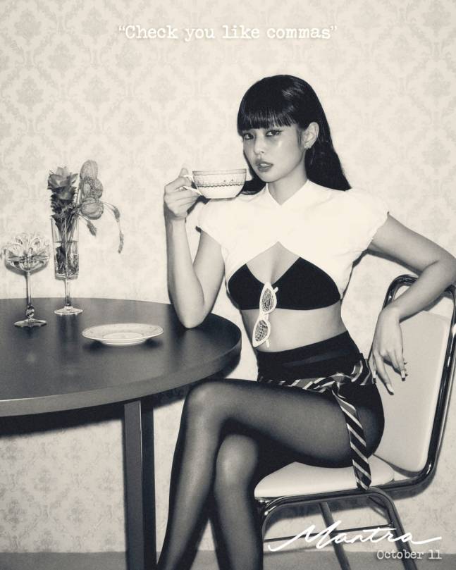 제니는 다양한 콘셉트를 자신만의 분위기로 소화하며 독보적인 아우라를 발산했다. 특히 콘셉트 포토 속에는 각각 “This that pretty girl mantra”, “Check you like commas”, “She’s that stunna”라는 문구가 적혀 있어 궁금증을 자아내며 신곡 ‘Mantra’에 대한 기대감을 높였다.