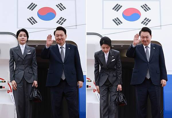 | ▲ 윤석열 대통령과 김건희 여사가 6일 성남 서울공항에서 필리핀, 싱가포르 국빈 방문 및 라오스 아세안 정상회의를 위해 출국하며 전용기인 공군 1호기에 올라 인사하고 있다. |
