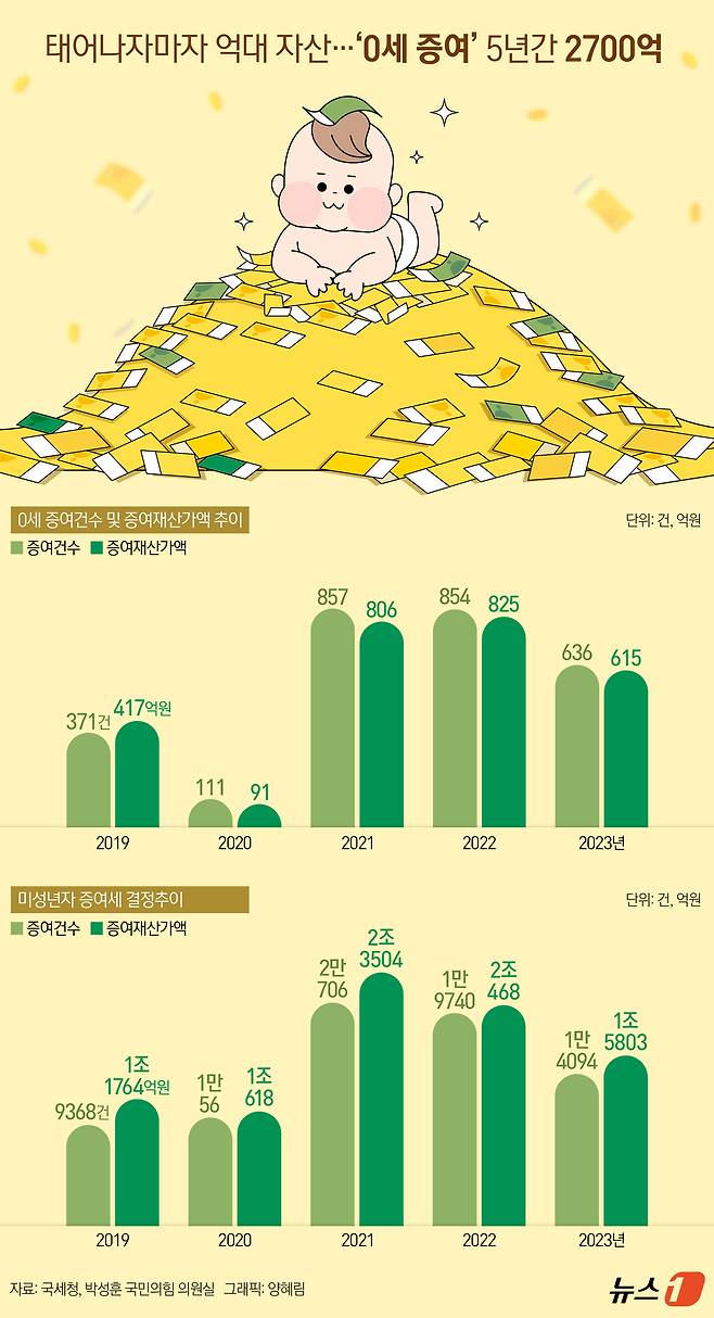 (서울=뉴스1) 양혜림 디자이너 = 최근 5년간 0세 신생아에 증여된 재산액이 2700억 원을 넘어선 것으로 나타났다. 같은 기간 증여세를 신고한 0세는 총 2800여명으로 증여 1건당 평균 재산액은 1억 원에 달했다. 6일 국회 기획재정위원회 소속 박성훈 국민의힘 의원이 국세청으로부터 제출받은 자료에 따르면 지난해 0세 636명이 증여받은 재산가액은 총 615억 원이었다. 전년(854명·825억원)보다 증여 대상은 218명, 증여액은 210억 원 줄었다.