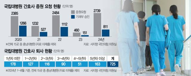 의료공백 사태가 장기화되는 가운데 국립대병원들이 올들어 정부에 3000명에 가까운 간호사 증원을 요청한 것으로 나타났다. 다만 이 중 정부에서 실제 승인한 인원은 요청 인원의 30%에도 못 미치는 800명 수준에 그쳤다. 인력 부족으로 인한 높은 업무강도탓에 저연차 중심으로 올해 8월까지 700명이 넘는 간호사가 병원을 떠나면서 필수의료 현장의 피로가 빠르게 누적되고 있는 실정이다.