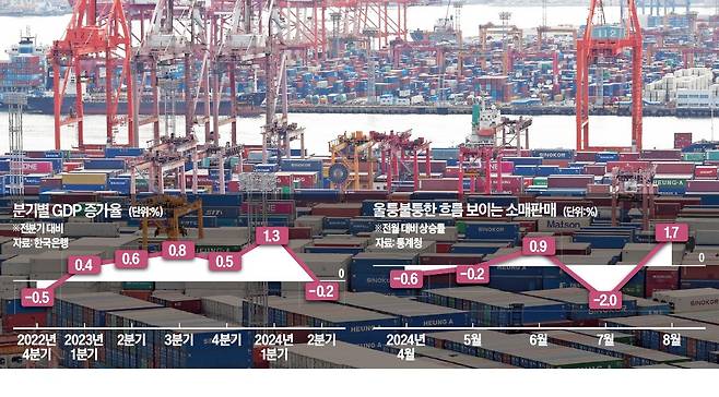 민간소비와 투자를 비롯한 내수 장기 침체가 이어지면서 지난 3분기 국내총생산(GDP) 증가율이 0%대 초반에 그쳤을 가능성이 제기되고 있다. 반도체·자동차 등 제조업을 앞세운 수출 호황의 온기가 하반기 들어서도 좀처럼 내수 부문으로 확산되지 않고 있기 때문이다. 한국은행의 기준금리 인하 등 ‘피벗’(통화정책 전환)이 이달에 이뤄지지 않으면 4분기 경기 회복도 장담하기 어렵다는 관측이 나온다.