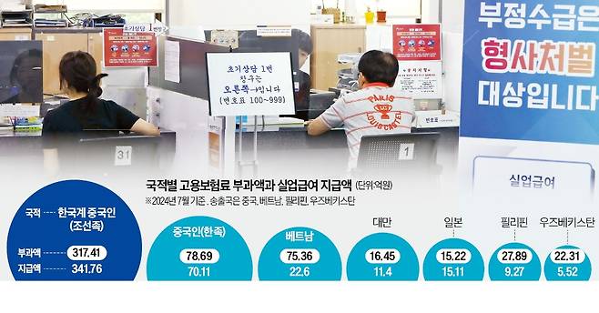 6일 김위상 국민의힘 의원이 고용노동부에서 받은 ‘외국인 실업급여 현황’에 따르면 올해 7월까지 국내에 취업(F-4, H-2 비자)한 중국 국적 동포가 납부한 고용보험료는 317억4100만원이었지만 이들이 받은 실업급여는 341억7600만원이었다. 24억원가량 고용보험 적자가 난 셈이다. 이런 적자는 2020년부터 최근 5년 동안 한 해(2023년)만 제외하고 되풀이됐다.