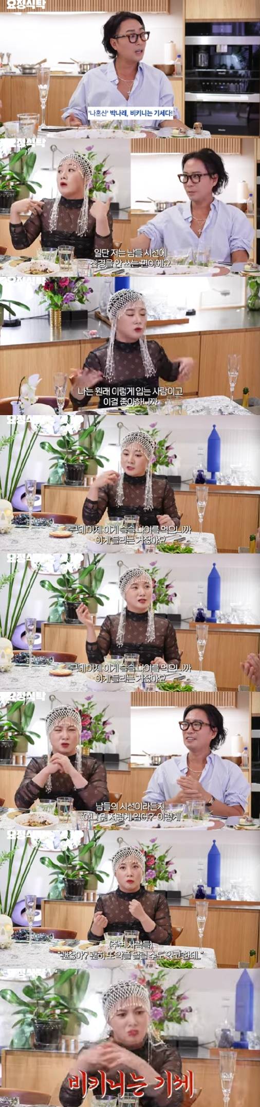 그는 "남들 시선을 신경 안 쓴다. 내가 입고 싶으면 있는다. 살이 쪘든 말든 나는 원래 이렇게 입는 사람이고 이걸 좋아한다. 슬슬 나이를 먹으니 남들의 시선이 들린다. 아니 뭐 저렇게 입어 이런다. 매니저 등 주위 사람이 '괜찮냐, 악플 달릴 수 있다'라고 걱정한다. 화가 났다. 비키니는 몸매라고 생각은 하는데 '비키니는 기세'라고 한 거다. '네가 욕을 해? 나 비키니 입었어 뭔데 네가?' 이렇게 화가 났다"고 말했다.