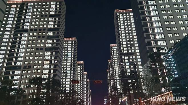 "우리 집도 불이 환하게 켜졌네"11월 말 입주를 앞두고 있는 한 입주민 부부가 자신이 입주할 집을 유심히 살피고 있다. 점등식은 사전점검 전 입주민을 초대해 모든 건물 동(棟)의 불을 켜서 전기공사를 마무리 확인하고, 무사한 준공과 다가올 입주를 축하하는 행사다.
