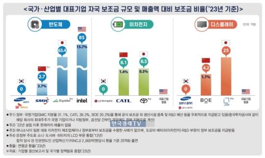 글로벌 경쟁이 격화되고 있는 반도체와 이차전지, 디스플레이 산업에 대한 국가적 지원이 시급하다는 주장이 제기됐다. 경쟁국가들이 자국 기업에 막대한 보조금을 지원하고 있지만 여전히 대한민국은 자국기업에 대한 직접 보조금 지원을 꺼리고 있어서다.