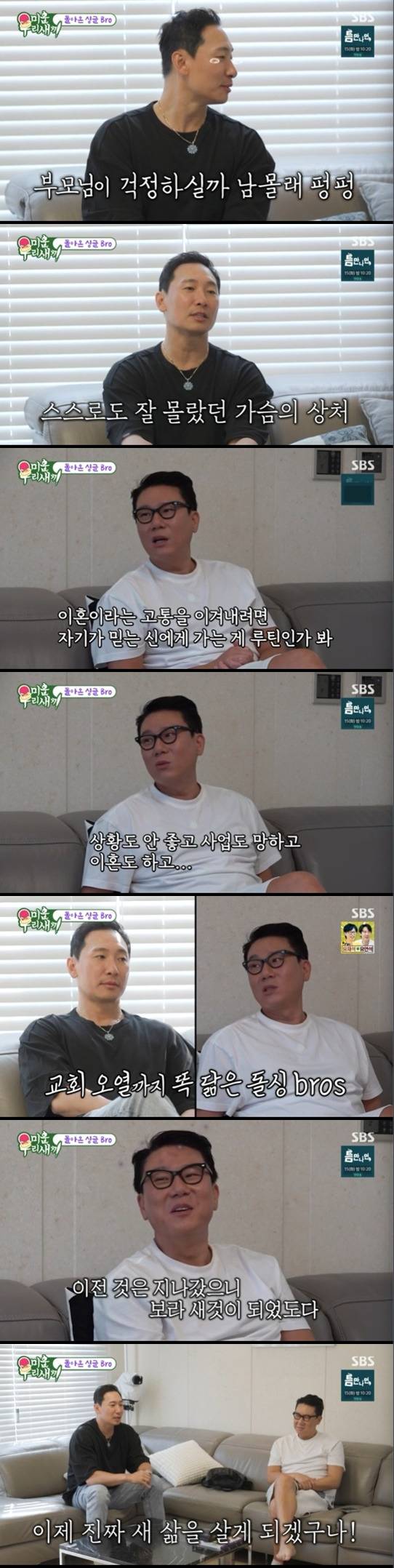 이상민은 "이혼이라는 고통을 이겨내려면 자기가 믿는 신에게 가는 게 루틴인가 보다. 혼자 어디 가기가 너무 창피하다. 상황도 안 좋고 사업도 망하고 이혼도 하면 사람도 못 만난다. 교회가 나에게는 천국인 거다. 아무도 없다. 두 시간 동안 오열했다. 평일 저녁에 힘들 때마다 울었다. 엉엉 울어도 누가 뭐라 안 한다. 부처님을 믿는 분들은 절에 가서 엉엉 운다고 누가 뭐라고 하겠냐"라고 고백했다.