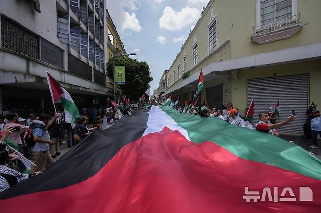 [과테말라시티=AP/뉴시스] 6일(현지시각) 과테말라 수도 과테말라시티에서 친팔레스타인 시위대가 가자 전쟁 1주년을 맞아 대형 팔레스타인 깃발을 펼치고 시위하고 있다. 2024.10.07.